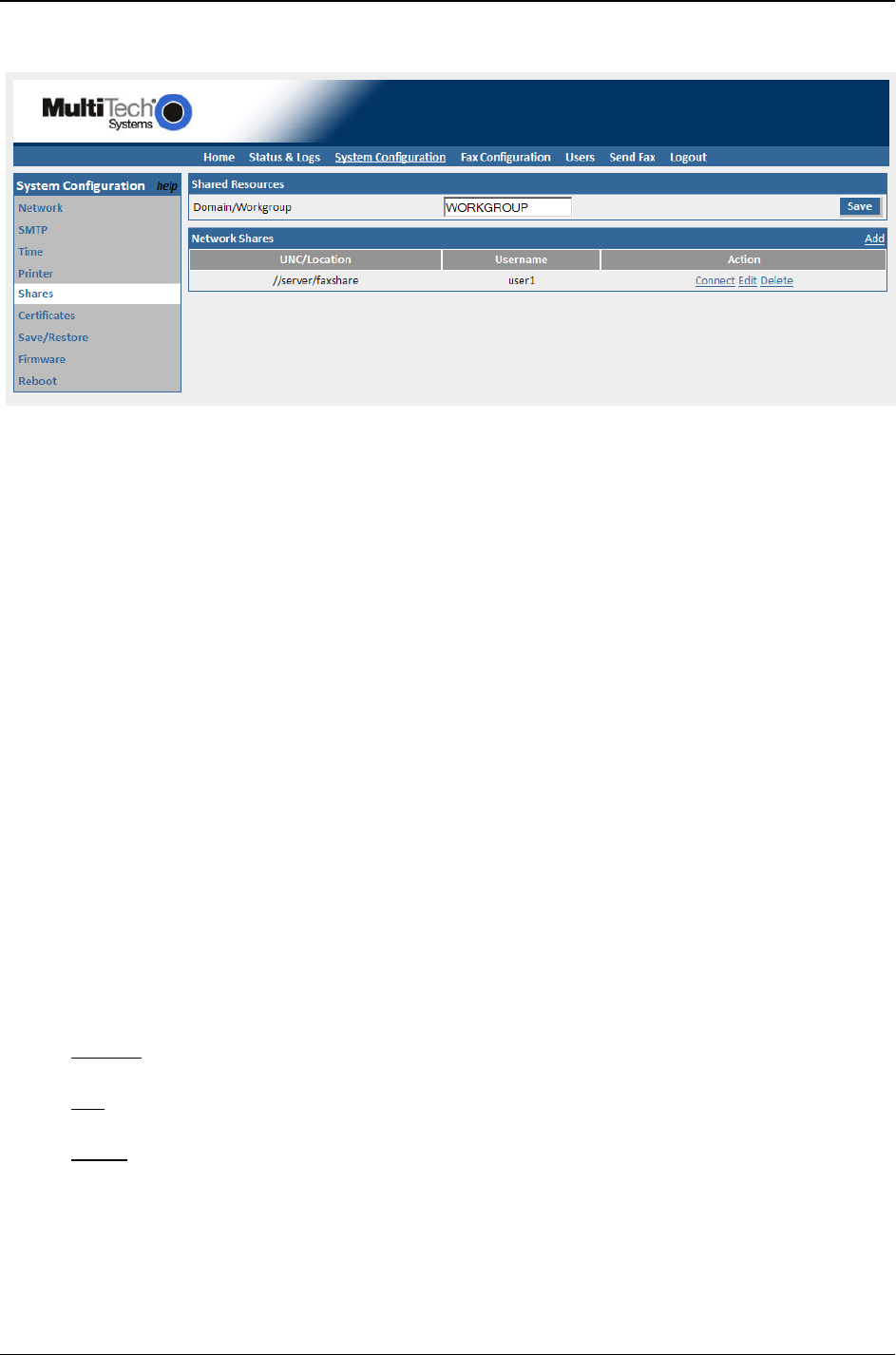 The shares screen allows the administrator to create a place for faxes to be sent for retrieval by more