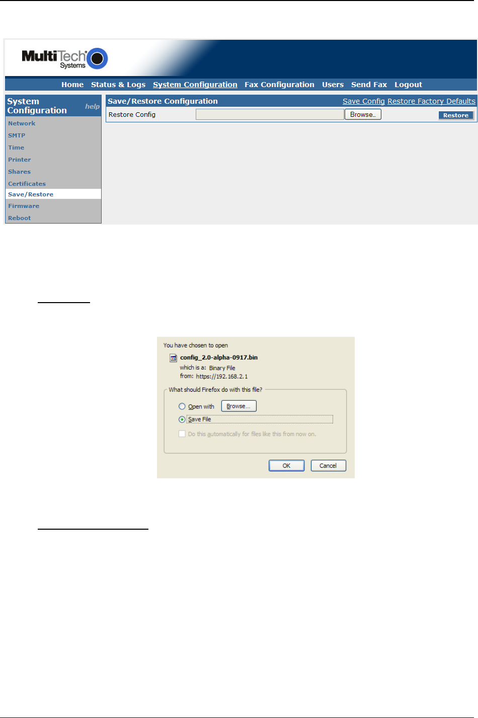 Once a saved configuration file has been entered in the restore config box, clicking the restore