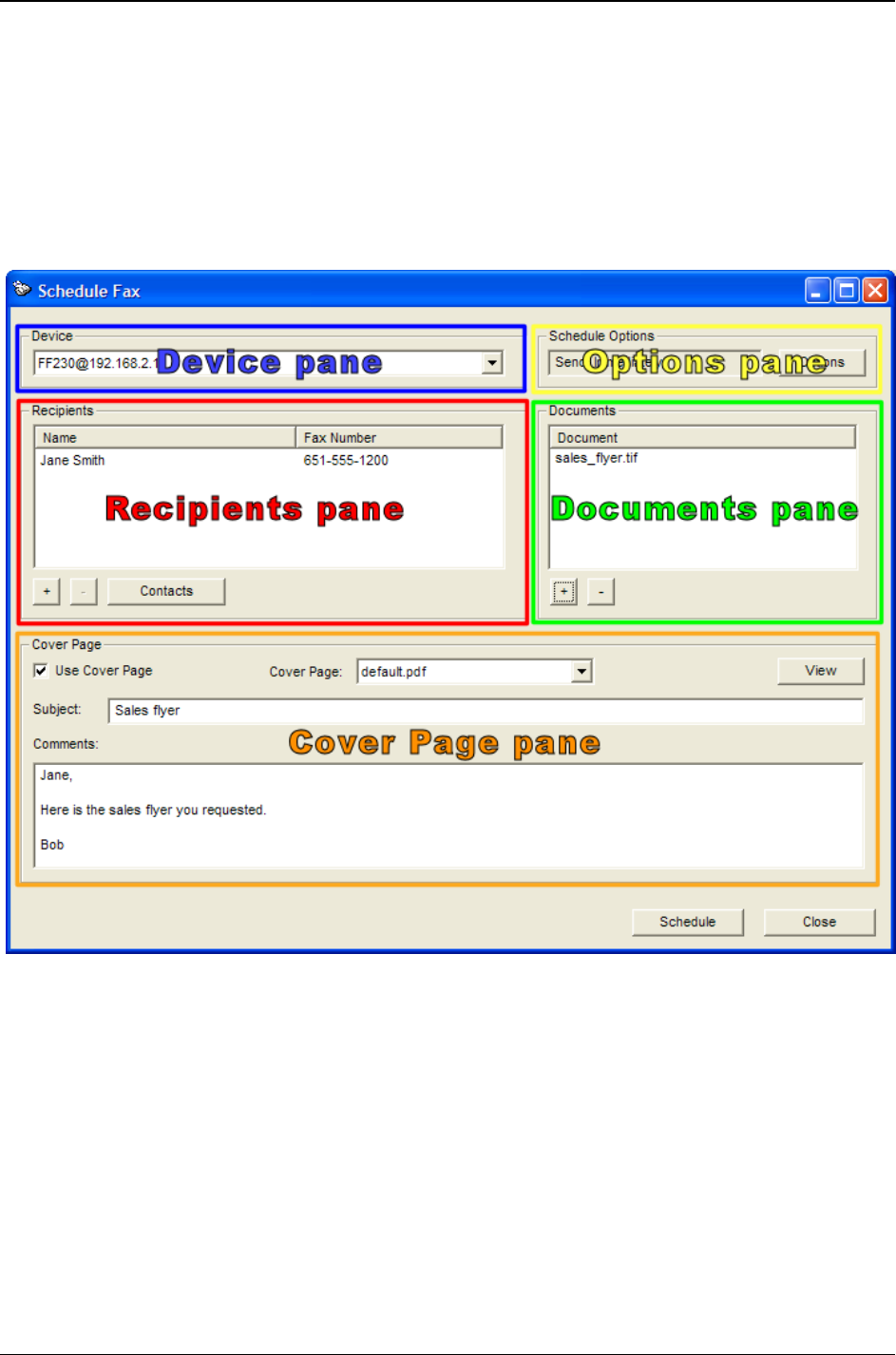 There are four sections (called ‘panes’ hereafter) to the Fax Scheduler: the Recipients pane, the